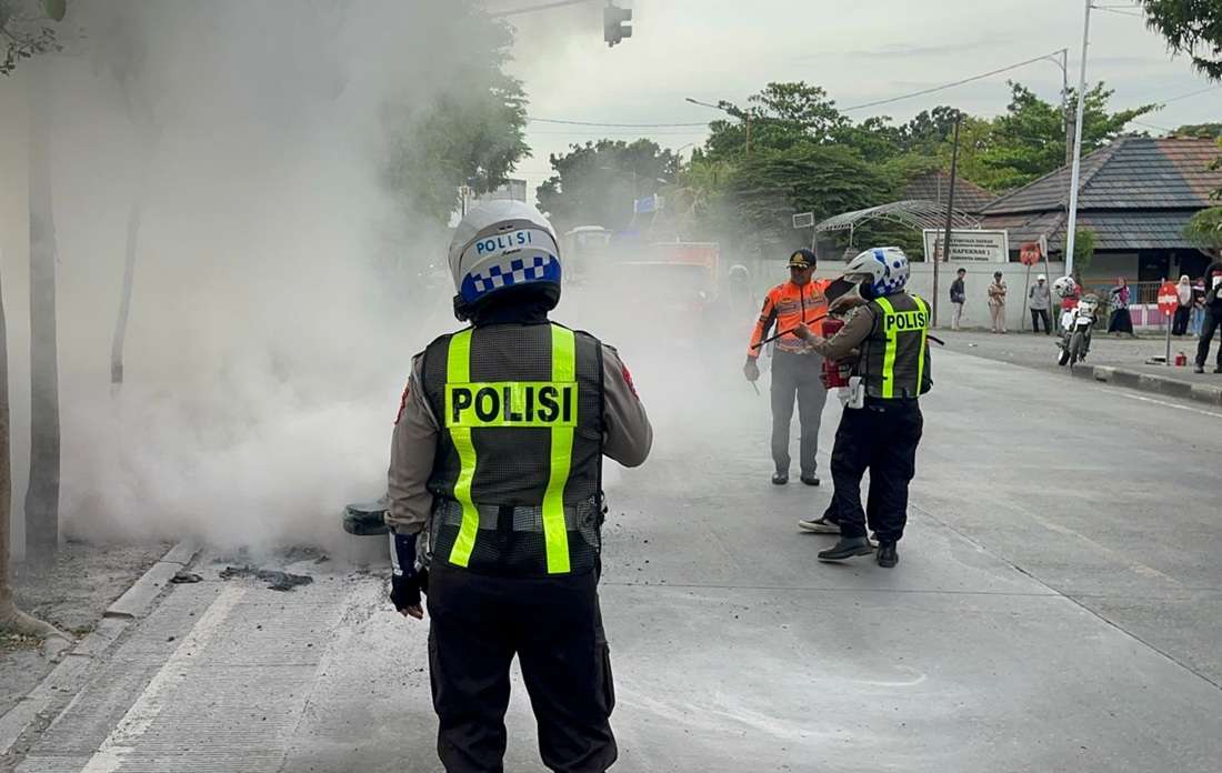 Meski sepeda motor milik Andri Gunawan, warga Lamongan, mengalami kerusakan parah, keberanian petugas berhasil mencegah potensi bencana yang lebih besar.